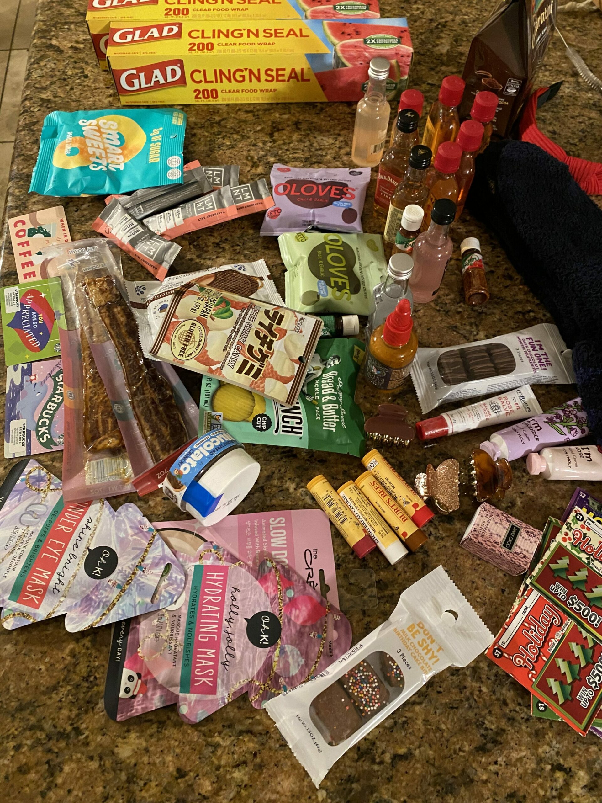The hit of the night was the games!! I got this idea from a friends’ Christmas party: Saran Wrap Ball! You wrap a ton of goodies into a ball, and then one person unwraps it while the person next to them rolls two dice (die? I don’t know these things). When that person hits doubles, the timer stops, and the ball goes to the next person. If the person unwraps a mini bottle of alcohol, it’s an option for them to take a shot (or hand the mini bottle to another willing adult to take the shot for them).